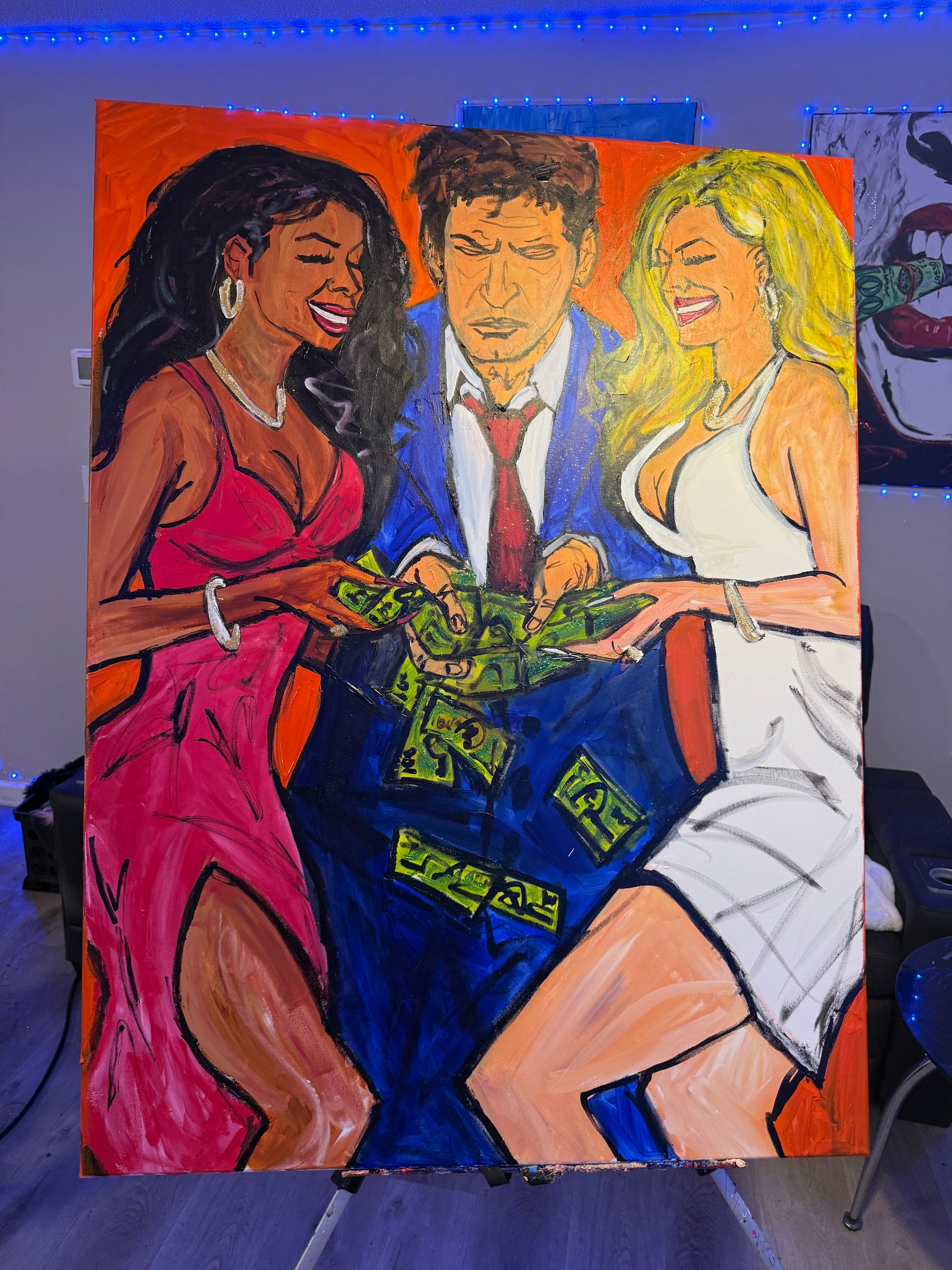 A Fair Exchange is a bold, expressive painting that captures the tension between desire, power, and money. Vibrant colors and dynamic figures tell a provocative story of balance and imbalance—where attraction, wealth, and intention collide. This piece makes a striking statement, inviting conversation and reflection on what we give, what we take, and the true cost of exchange.